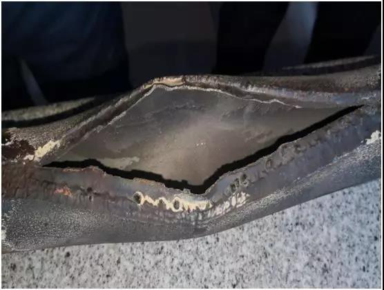 經(jīng)過檢查后發(fā)現(xiàn),造成本次事故的原因是過熱器爆管。流過熱器低溫段左側(cè)第二屏前向后數(shù)第三根管爆管,爆口距頂棚約4米,爆口外表面有長約200mm、寬約10mm溝痕,厚度1mm溝痕,斷口大部分壁厚小于1毫米。斷管后進(jìn)行通球未發(fā)現(xiàn)異物,調(diào)取2018年10月9日1號機(jī)組啟動以來壁溫及煙溫曲線,未發(fā)現(xiàn)超溫情況,該管段附近無吹灰器(排除吹灰器吹損原因)。由于管子爆口下部管段存在明顯減薄缺陷,且原因不清,為進(jìn)一步分析查明爆管及管子減薄缺陷的形成原因,2月18日,將爆管管樣寄至熱工院進(jìn)行檢測分析。