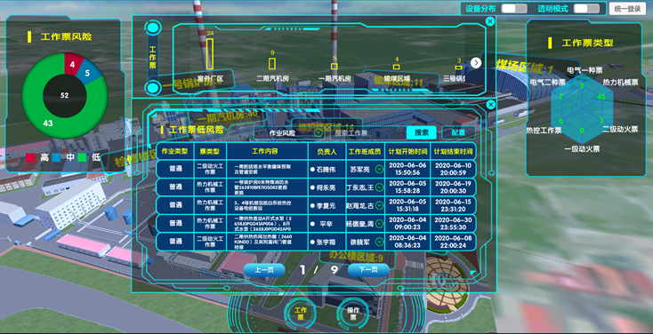 接入電廠的兩票系統(tǒng)和缺陷系統(tǒng)數(shù)據(jù),只篩選出當(dāng)日正在執(zhí)行的兩票和未完成的缺陷。根據(jù)兩票和缺陷的內(nèi)容通過(guò)提前預(yù)設(shè)好的KKS編碼和關(guān)鍵字關(guān)聯(lián)到設(shè)備或者區(qū)域上,實(shí)現(xiàn)兩票和缺陷分區(qū)域分布顯示。將兩票中風(fēng)險(xiǎn)等級(jí)高的進(jìn)行報(bào)警顯示,提醒安全管理人員注意。