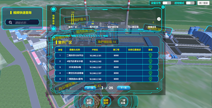 接入電廠現(xiàn)有的視頻監(jiān)控系統(tǒng)、門禁系統(tǒng)以及項(xiàng)目現(xiàn)場(chǎng)建設(shè)的定位設(shè)備,實(shí)現(xiàn)定位設(shè)備、視頻監(jiān)控設(shè)備、門禁設(shè)備的區(qū)域分布,三維可視化分布、設(shè)備快速查找、視頻快速調(diào)取、門禁日志快速查詢的功能。