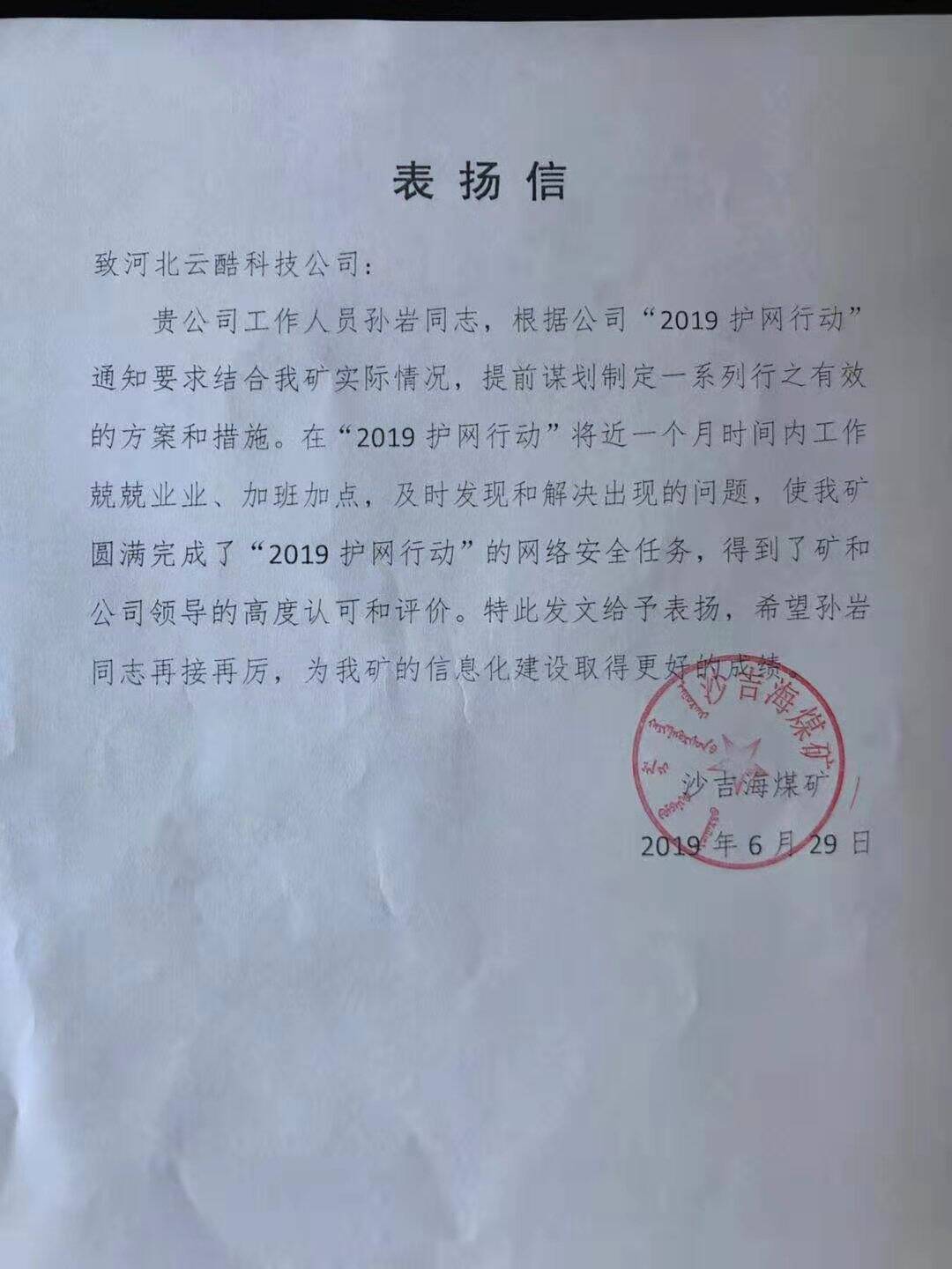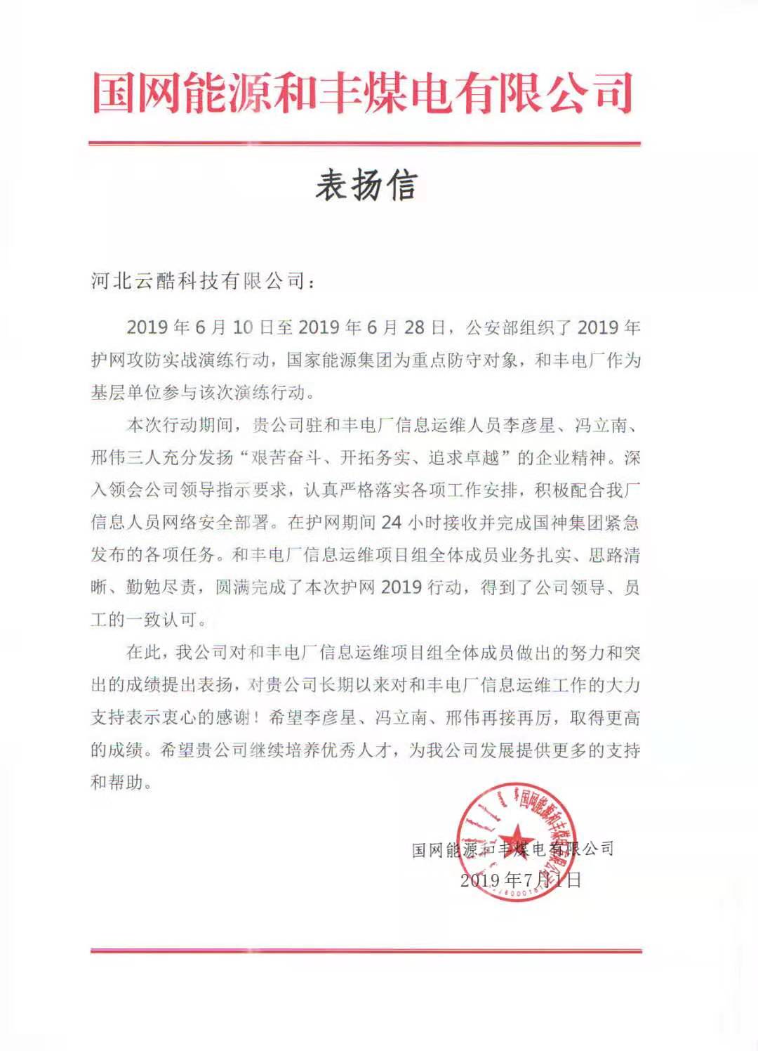 云酷科技運維服務(wù)部的四位同事憑借優(yōu)異的技術(shù)實力和敬業(yè)精神,在本次的演練行動中獲得某煤電有限公司的高度贊揚,并向我司發(fā)來了表揚信: